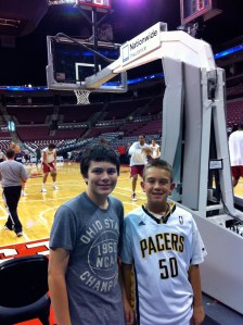 So what if Lebron James is gone. So what if former Tar Heel Danny Green got cut from the Cavaliers yesterday. The show in Cleveland must go on and tonight it made a stop in Columbus, Ohio for a pre-season game against the Milwaukee Bucks. Thanks to the kindness of my good friend “D-Rich”, “the boy” got to be a ball boy for the second year in a row. Last year he was more of a spectator during the game, but this year he was busy-busy! We arrived in time for pre-game shoot around so the boys were able to rebound and chase down stray shots.