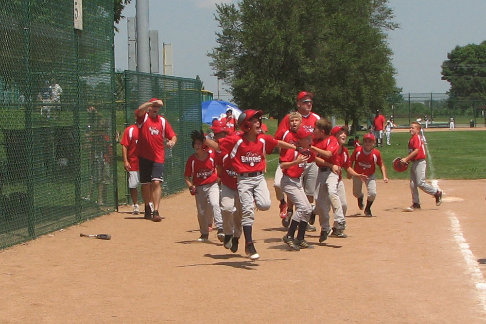 The details are still a bit fuzzy but somehow, remarkably, the Red Barons would end up with the bases loaded, the score 4-3 and STILL two outs. At least 2 of the kids that had reached base were down to their last strike. The player on first had just battled back from an 0-2 count to get a walk. The next player hit a shot to the short stop, he bobbled it and then his throw to first went wide. The whole time this was going on, the players from 2nd and 3rd were running towards home. When the dust cleared, the Red Barons had pulled off the unbelievable! Parents were screaming, hugging, high fives and literally crying. You can see from the image, the kids were going crazy. It was a moment I will not soon forget.