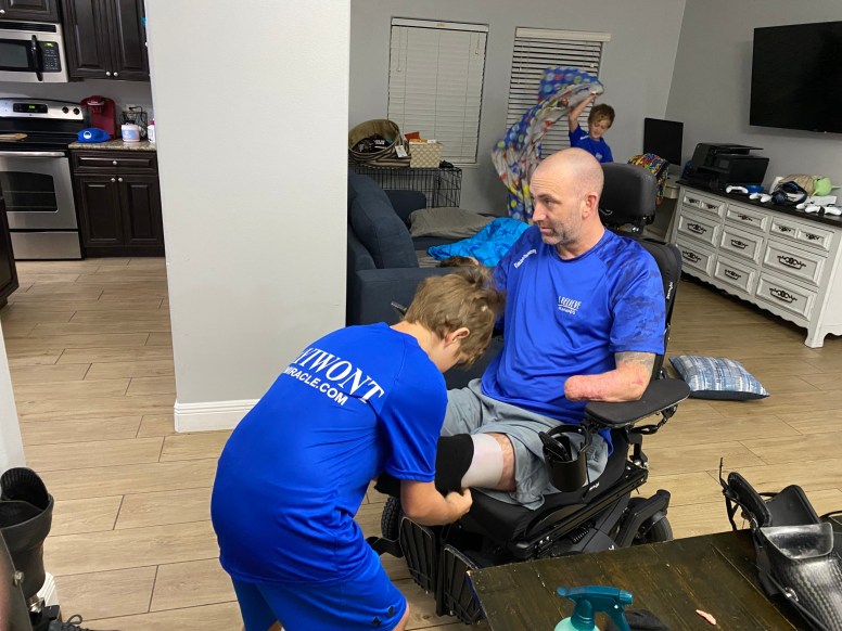 The house was buzzing as we got 4 kids and Gary ready for the big day. I cannot say enough how impressed I was with the 4 children as they were dressed and ready to go. I walked in the living room and Garys oldest son was helping him prep with the various stages necessary to wear his blades. He knew all of the steps and everything that needed to be done just right to avoid injury and sores. It was remarkable. I asked if I could take some pictures.