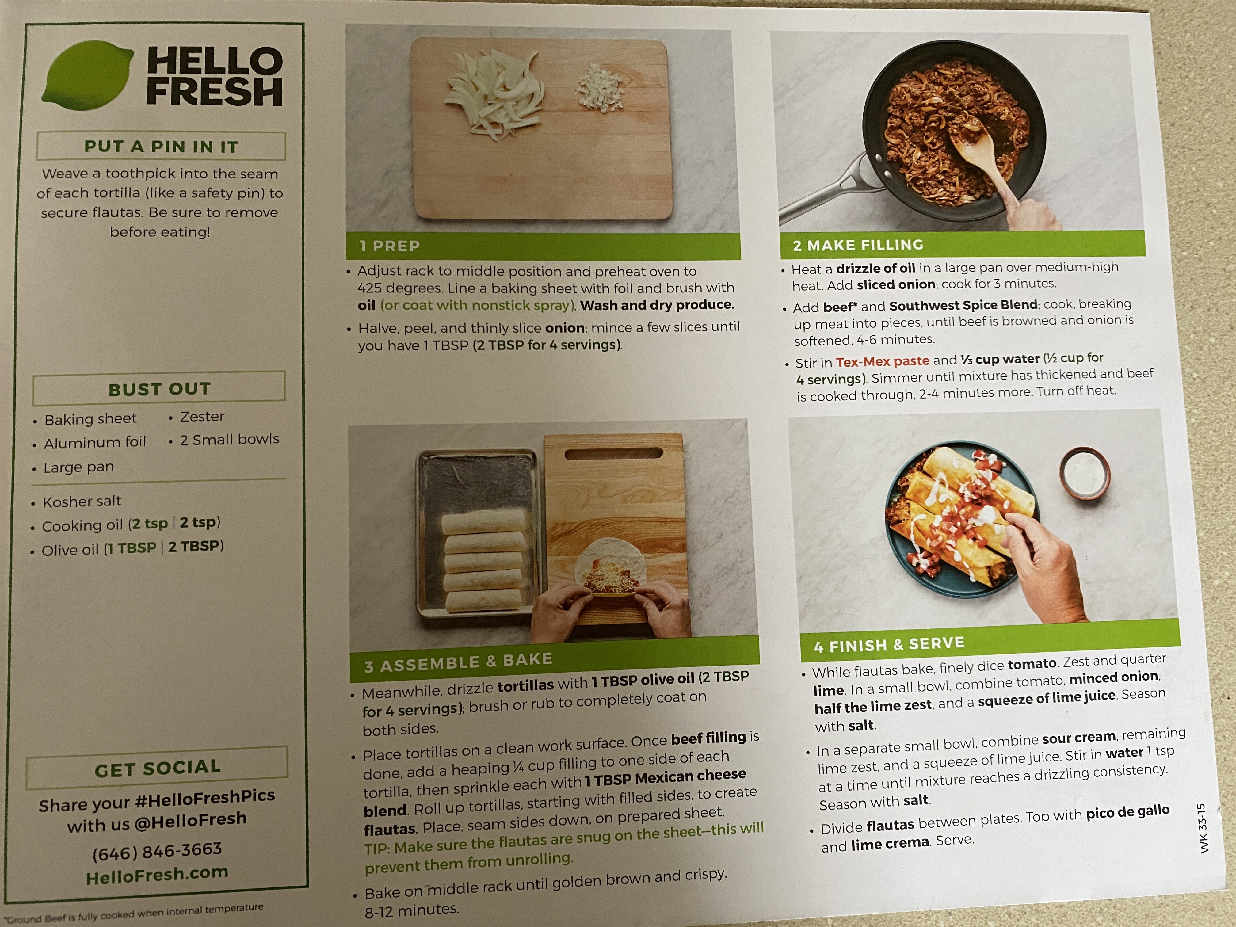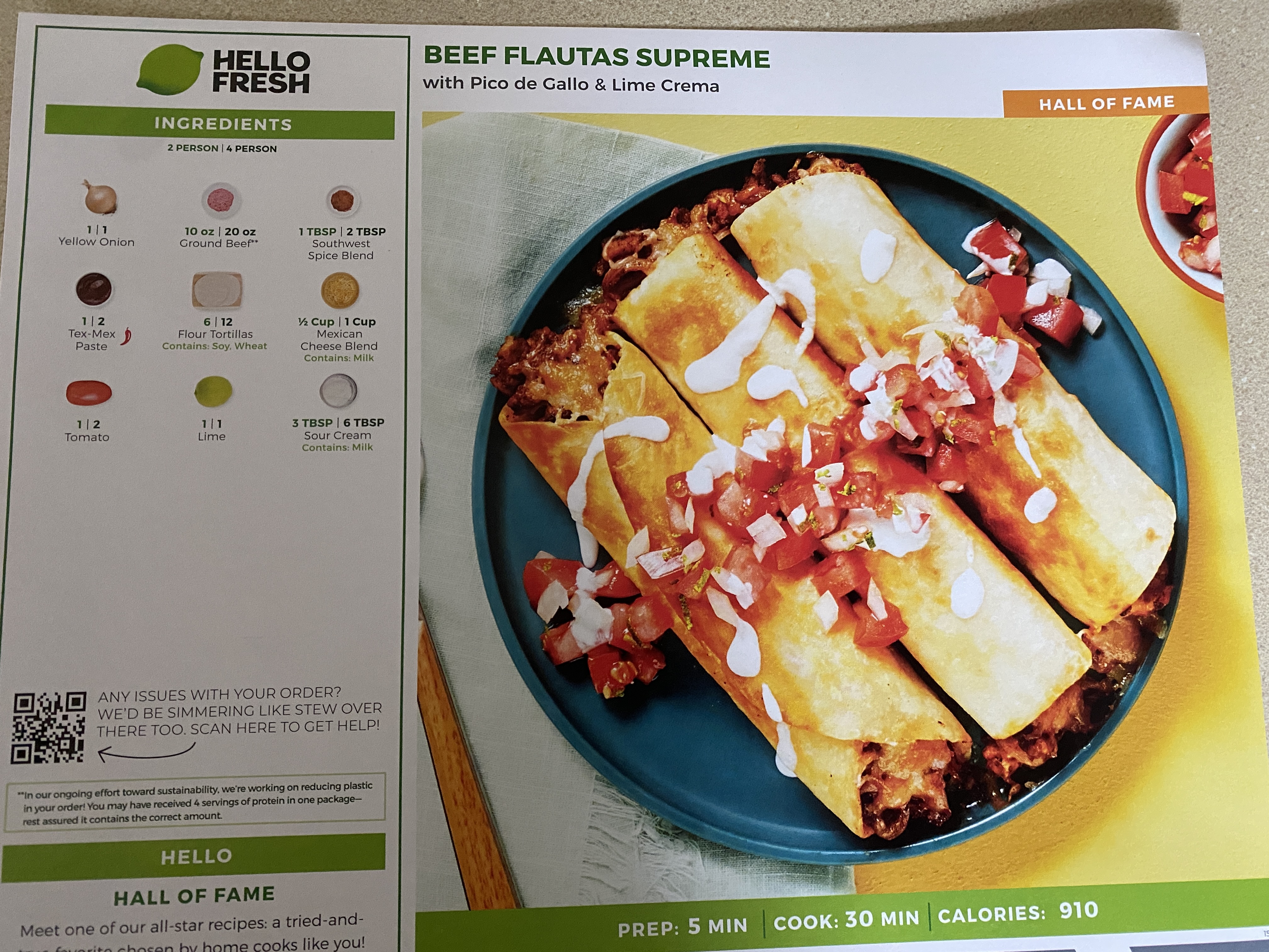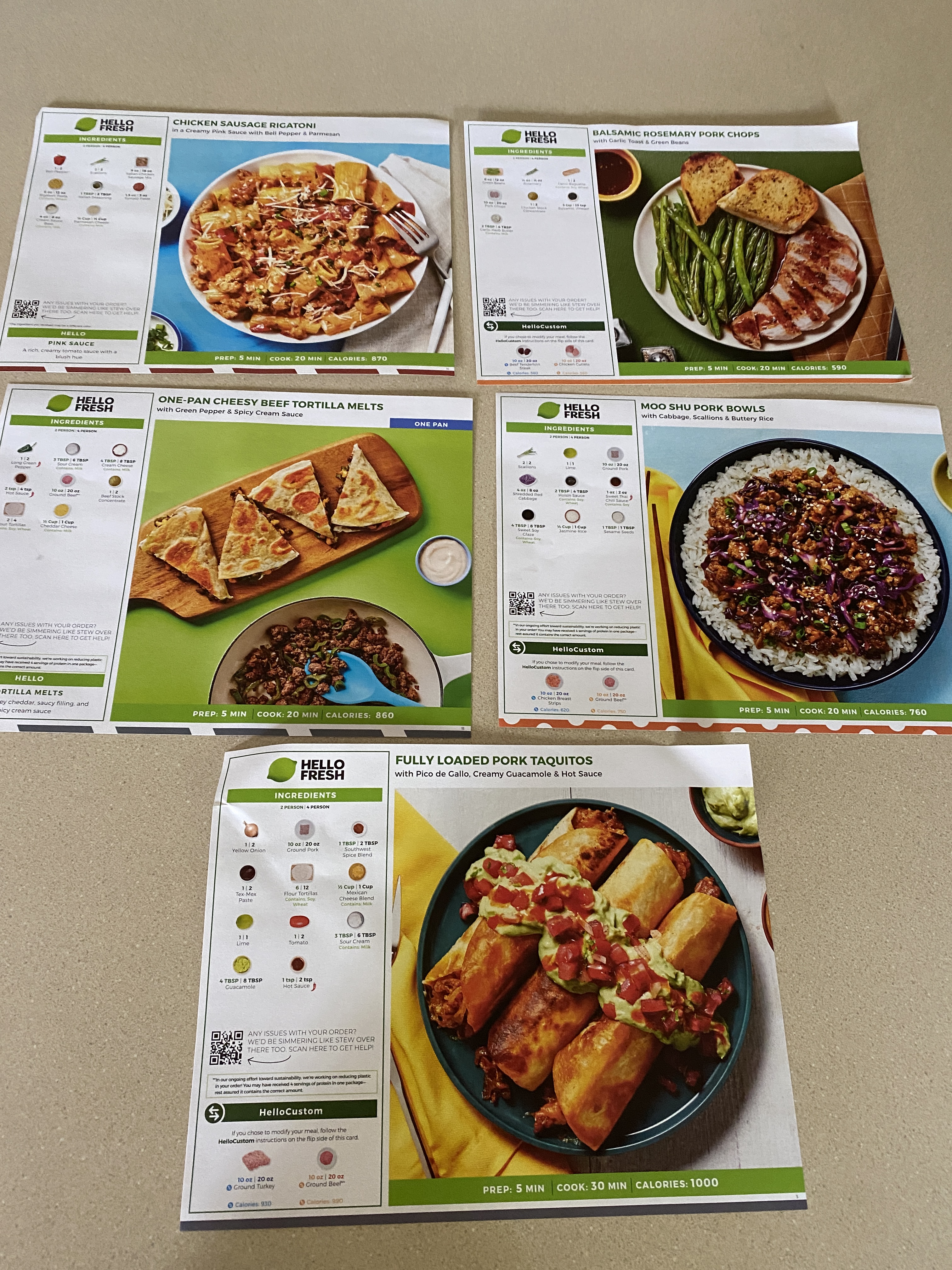Each menu card has the estimated prep time and calories per serving right on the bottom of the card. The only things you might need from home are butter, oil, salt and pepper. Things you likely already have around the house.