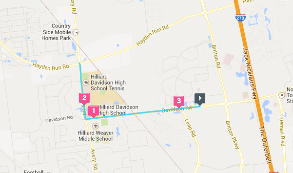 We’ll kick off at Norwich Elementary School in Hilliard at 8:30am on Thanksgiving morning. You can park and leave your car there. From Norwich, we’ll go west on Davidson to Avery, make a right, go down Avery about 1/2 mile and then loop back. The sidewalk along Davidson and Avery is double wide so there is plenty of room. Here’s a course map:
