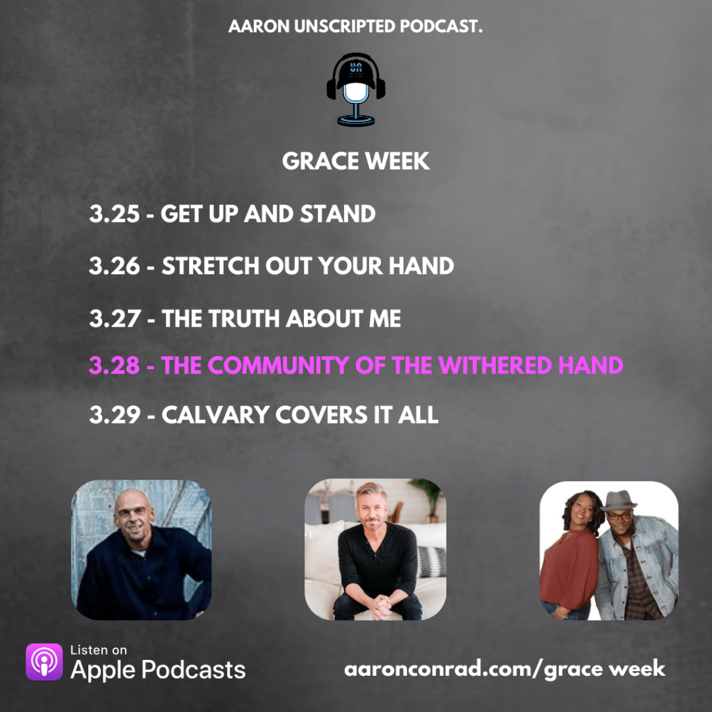 Welcome to day four of Grace Week. We’re almost to Good Friday. Before we get there, we need to pause and talk about the Community of the Withered Hand. By now you might have considered standing up and showing your hand. If you have, let me be the first to welcome you here. I hope you receive that like a warm hug. I hope that someday we can have a community where we are not ashamed but rather welcomed to share our struggles. This is day four of Grace Week.