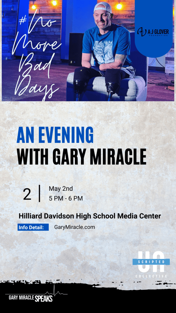 The Unscripted Collective in partnership with The AJ Glover Foundation is excited to announce that Gary Miracle is coming to Hilliard, Ohio on Thursday, May 2nd. Gary will share his story and be available for questions and pictures. The event will be held at Hilliard Davidson High School in the Media Center from 5:00pm – 6:00pm. This event is open to the public and there is no charge. You can find out more at the link below.